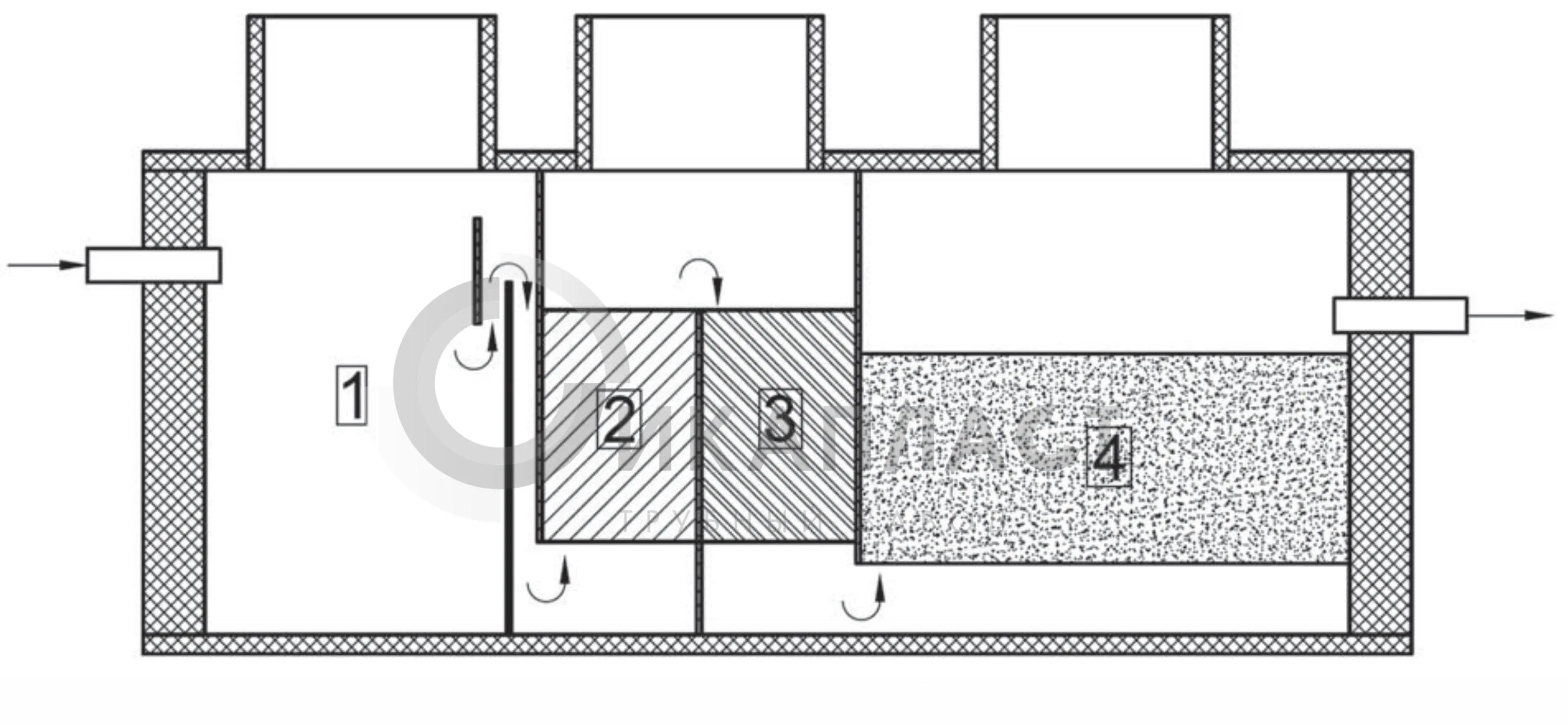 1. в первом блоке происходит усреднение стока и основное осаждение наиболее крупных загрязнений под действием силы тяжести;
